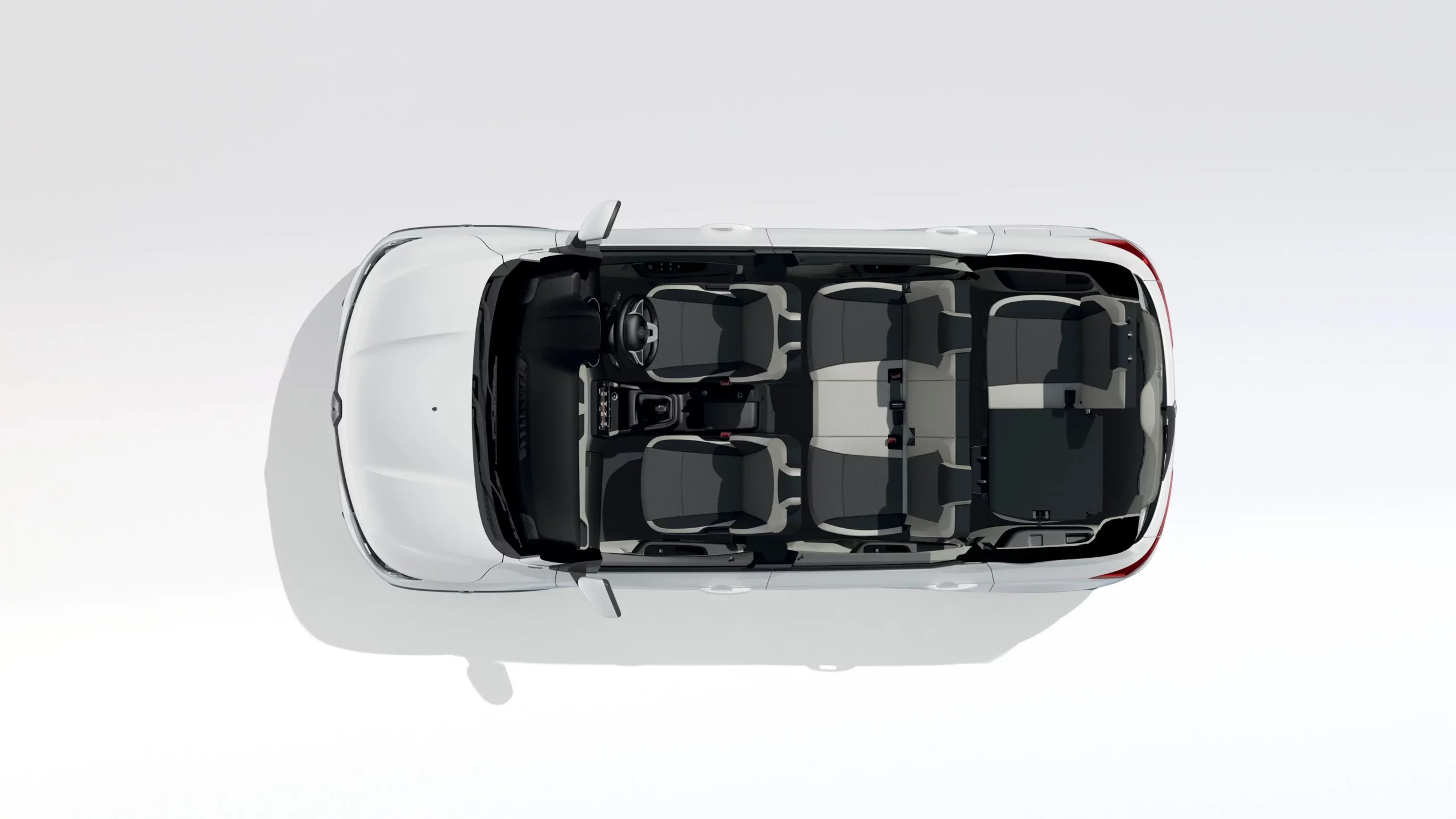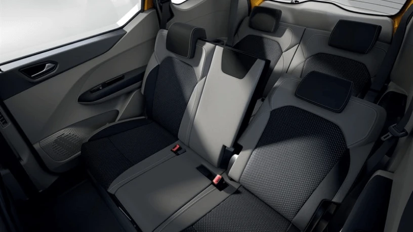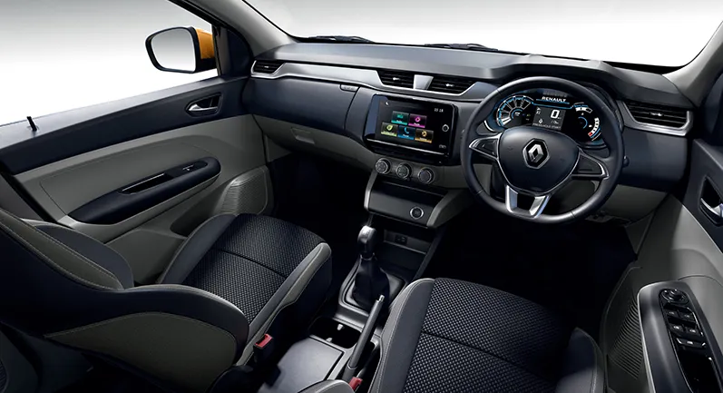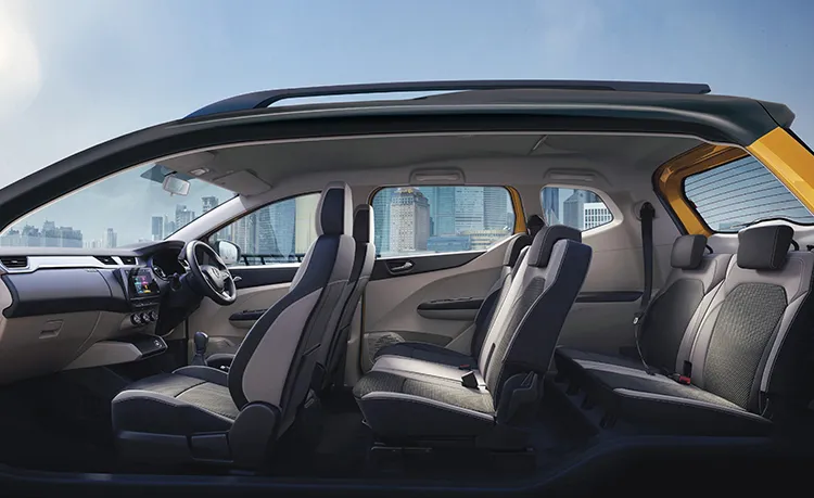 Explore the modern interior of the Renault Triber, featuring a dual-tone design, harmonious trim, and a sophisticated center fascia with sleek chrome edges. The super-spacious Triber showcases a stylish dual-tone dashboard with silver accents, an LED instrument cluster, and independent aircon controls with vents in the 2nd and 3rd rows.